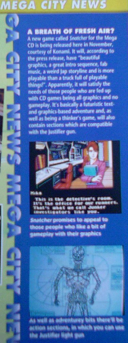 I was looking through some old Mega Drive magazines at a friend's house last night, and I found a couple of bits about Snatcher. No full-size previews or reviews, disappointingly, but I found an advert and a little news snippet with some early screenshots. They're not terribly interesting themselves (although one of the screenshots uses a different font from the final game), but they've made me interested in getting some of the issues from around that time, so I can get a proper review.