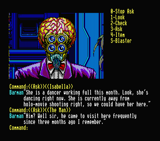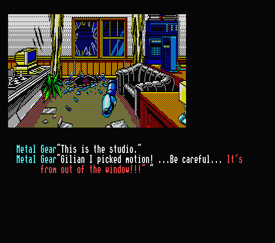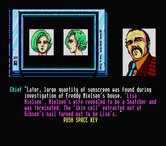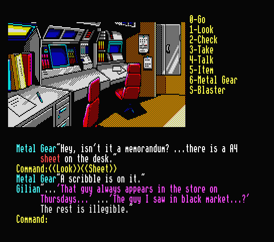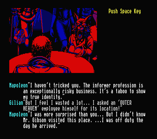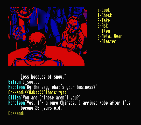 Of course the MSX version has shooting sequences. I tend to not try and take pictures of those as I end up dead rather quickly. You hold shift to draw the blaster and use the num-keys to determine where in the grid you want to shoot. Anyway, MORE PICTURES! If anyone knows the main difference between Japanese and English Snatcher, they'd know the upcoming part has jailbait nudity! I actually missed the 2 more revealing frames of animation as I was using the fast forward function hacked in by the translators and zoomed right by the 1st one and was late for the 2nd one. To those who care, sorry.