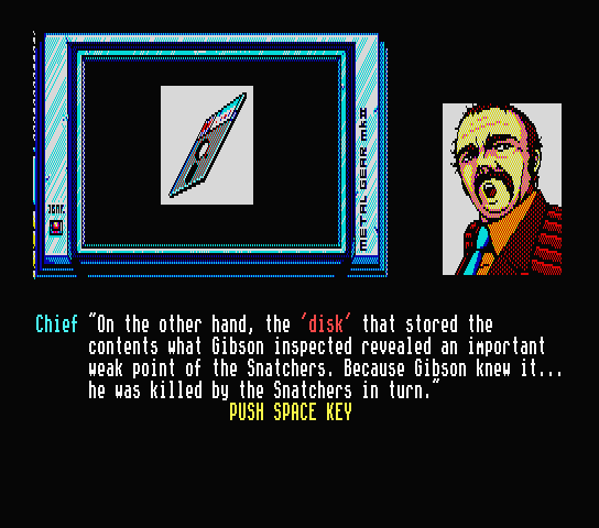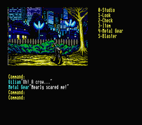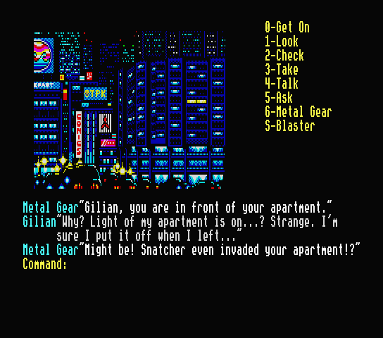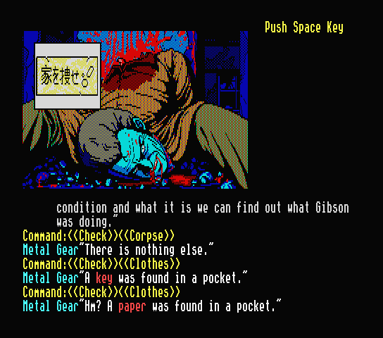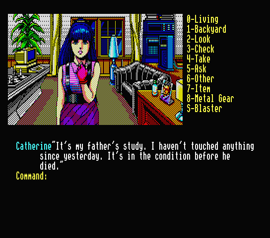 On today's episode of "Snatcher MSX" we visit Gibson's home to mol- I mean CONSOLE his underage daughter and get any evidence. The Computer versions seem to have an extra puzzle involving a single key. Answer is the Home Key. Also a 4th wall breaker. OH THAT KOJIMA!