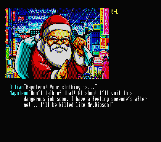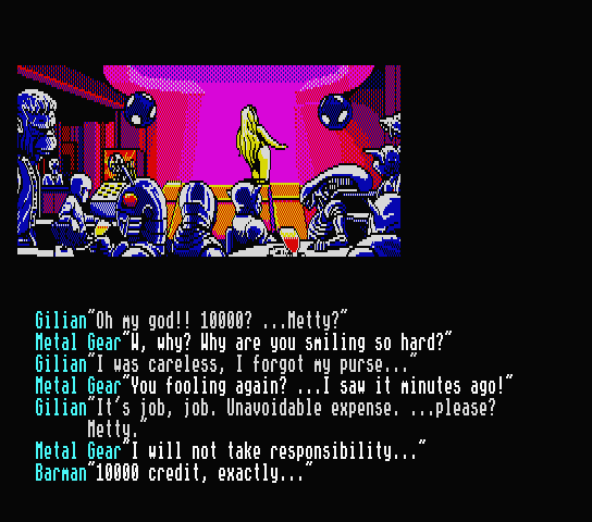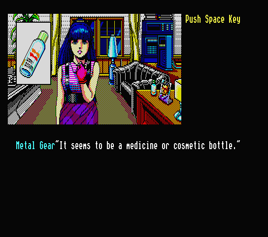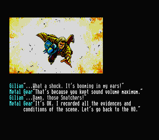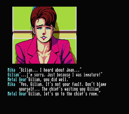 Of course the MSX version has shooting sequences. I tend to not try and take pictures of those as I end up dead rather quickly. You hold shift to draw the blaster and use the num-keys to determine where in the grid you want to shoot. Anyway, MORE PICTURES! If anyone knows the main difference between Japanese and English Snatcher, they'd know the upcoming part has jailbait nudity! I actually missed the 2 more revealing frames of animation as I was using the fast forward function hacked in by the translators and zoomed right by the 1st one and was late for the 2nd one. To those who care, sorry.