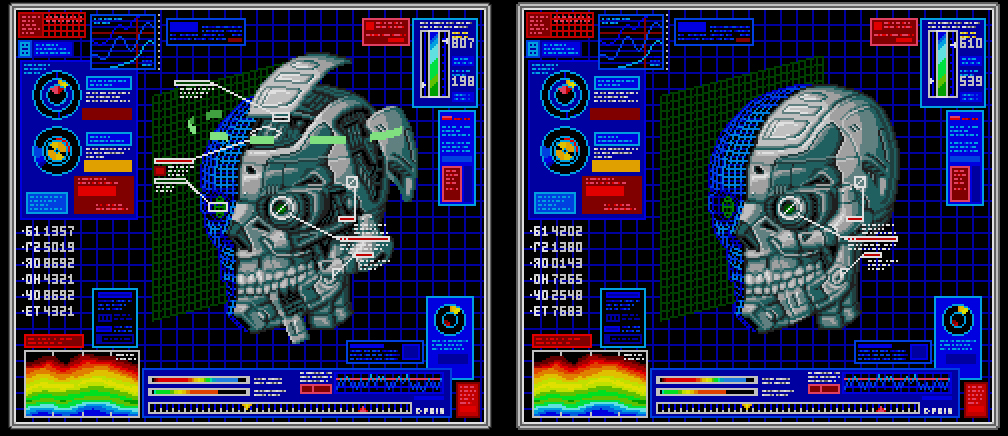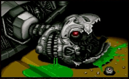 Then we have the English Sega CD version where they decided that the SNatcher design was too derivitive of the Terminator Endoskeleton design and added green panels to various sections and made the eyes glow GREEN.