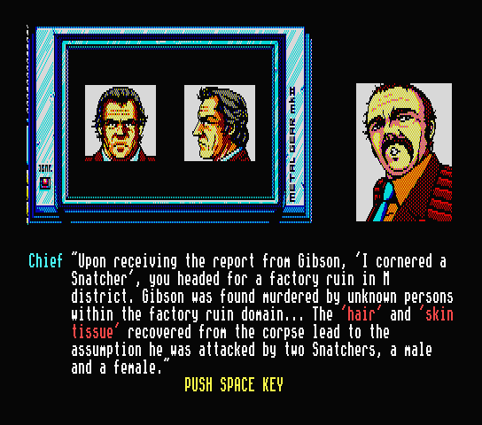 On today's issue of MSX Snatcher shots, I deal with an LSD junkie and combat a couple. They all deserved it, I swear! Just as a warning, this part includes NUDITY! More than likely, however, this will actually make people WANT to look, but whatever.