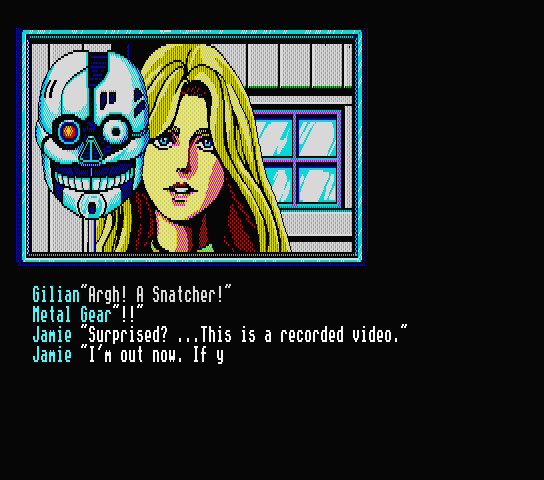 Of course the MSX version has shooting sequences. I tend to not try and take pictures of those as I end up dead rather quickly. You hold shift to draw the blaster and use the num-keys to determine where in the grid you want to shoot. Anyway, MORE PICTURES! If anyone knows the main difference between Japanese and English Snatcher, they'd know the upcoming part has jailbait nudity! I actually missed the 2 more revealing frames of animation as I was using the fast forward function hacked in by the translators and zoomed right by the 1st one and was late for the 2nd one. To those who care, sorry.
