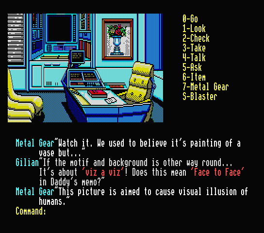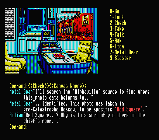 2. Interface less Streamlined in the MSX version, which makes it harder. When taking this new batch of pics, I got stuck again because look/checking doesn't "take" the object, and while it's usually obvious what you have to take, it didn't occur to me that I had to "take" the picture of Red Square.