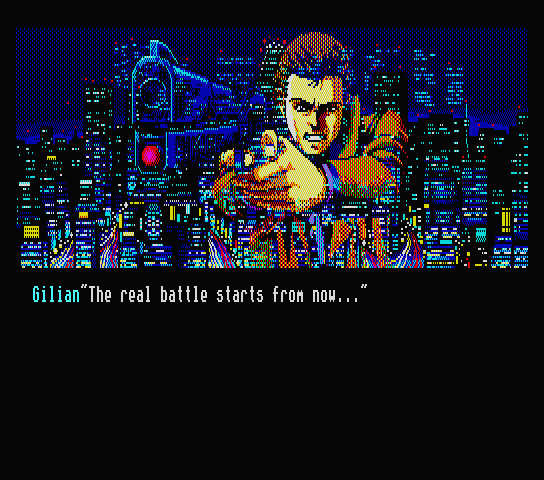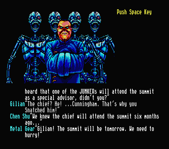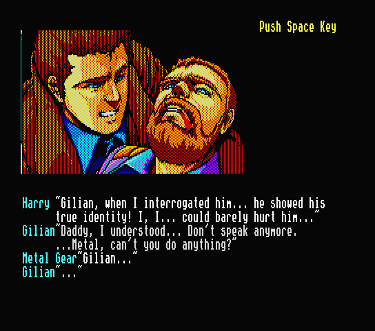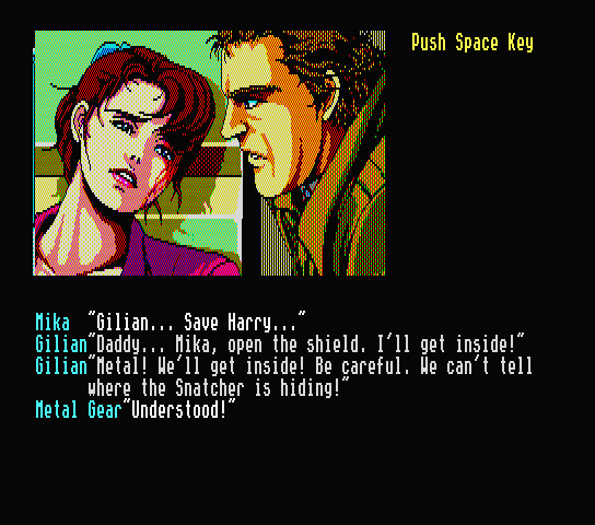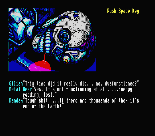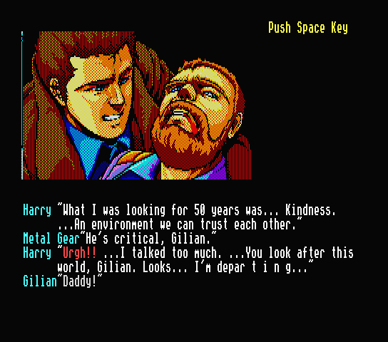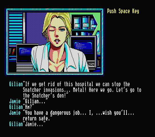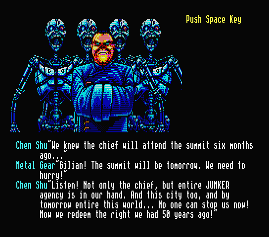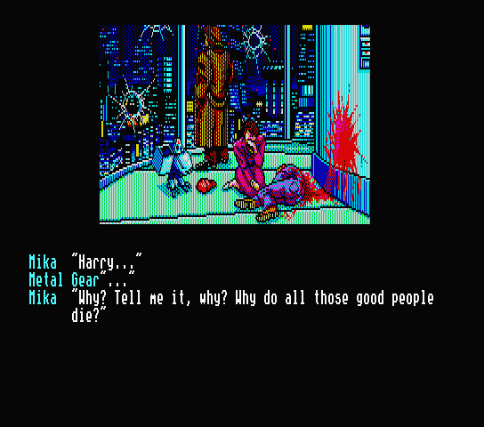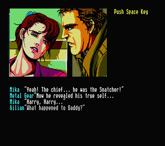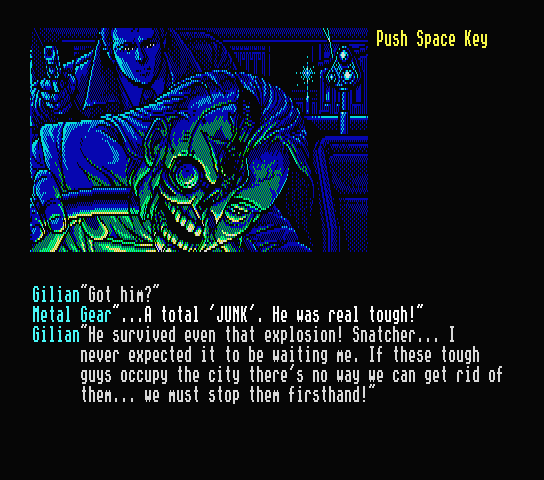 And thus we reach our conclusion. Due to a rushed schedule, Kojima's cyberpunk masterpiece was published with a dark and depressing cliff hanger. We find Snatcher-ham, who has taken Mika hostage, and dispose of him. After giving us a farewell in what I assume is Russian (as Russian letters are used in the PC88 version) and his power fades, we witness a pan-up of Junker HQ and see Mika crying over Harry's body, and Gillian declaring that the fight has just begun.