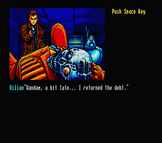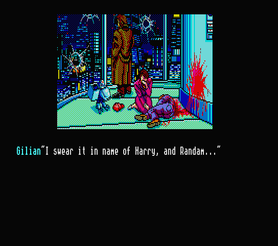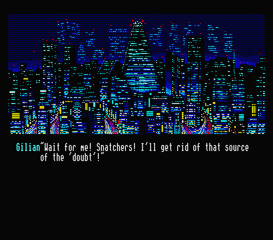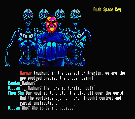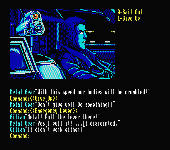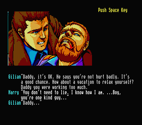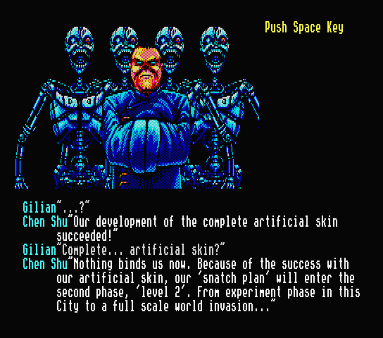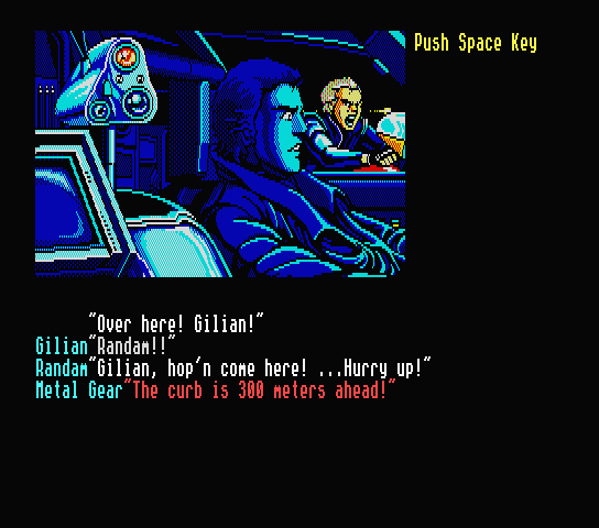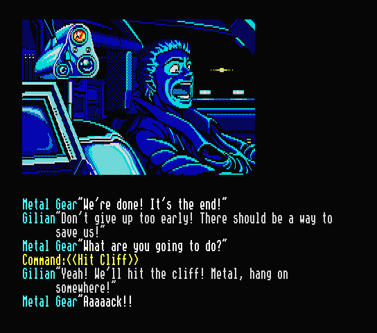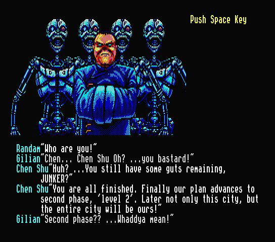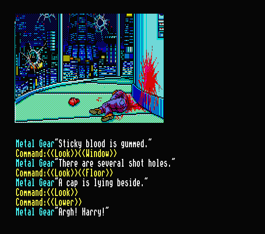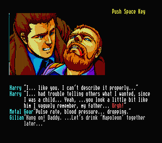 And thus we reach our conclusion. Due to a rushed schedule, Kojima's cyberpunk masterpiece was published with a dark and depressing cliff hanger. We find Snatcher-ham, who has taken Mika hostage, and dispose of him. After giving us a farewell in what I assume is Russian (as Russian letters are used in the PC88 version) and his power fades, we witness a pan-up of Junker HQ and see Mika crying over Harry's body, and Gillian declaring that the fight has just begun.