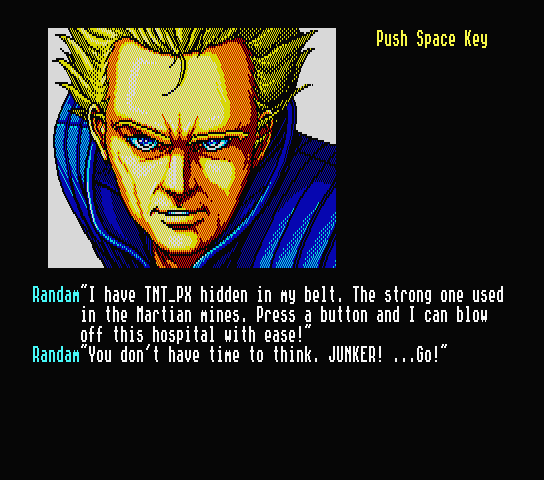 The MSX2 version says "Goodbye." The PC-8801 version says "I wish you luck/success", but it's spelled wrong.AwesomeBrand wrote:After giving us a farewell in what I assume is Russian (as Russian letters are used in the PC88 version)