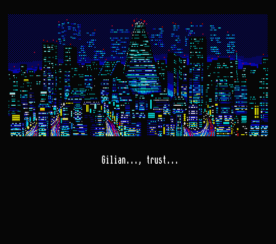 After the intro where Gillian is introduced is the first disc change. The only thing I could make out was a 4 and a 2 among all the weird squiggles. Since normally the small text at the beginning is the person speaking I ignored the meaning of this 4. What the game is TRYING to tell me is to put disc 4 into drive 2 I think but I didn't know this so I replaced the PROGRAM disc with disc 2 .... and without warning I'm flooded with text!