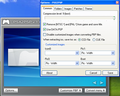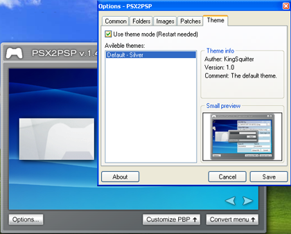 3.) If you are not prompted right away to work in "Theme" mode, open the Program PSX2PSP and click the "Options" button. Hit the "Themes" tab and check "Use Theme Mode". Save and close the program.