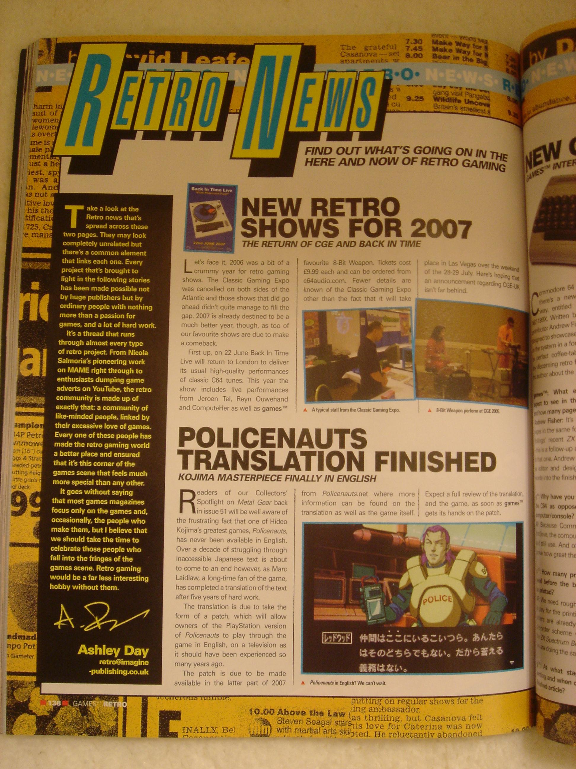 Imagine my surprise when during a trip to the UK I should discover a new magazine article about the Policenauts translation. I was staying at my cousin's house when his copy of gamesTM arrived this morning. When I got to the Retro section I discovered a news story about the project. I took a picture of it but am unable to upload it right now. Hopefully the magazine will hit shelves before I leave the country.