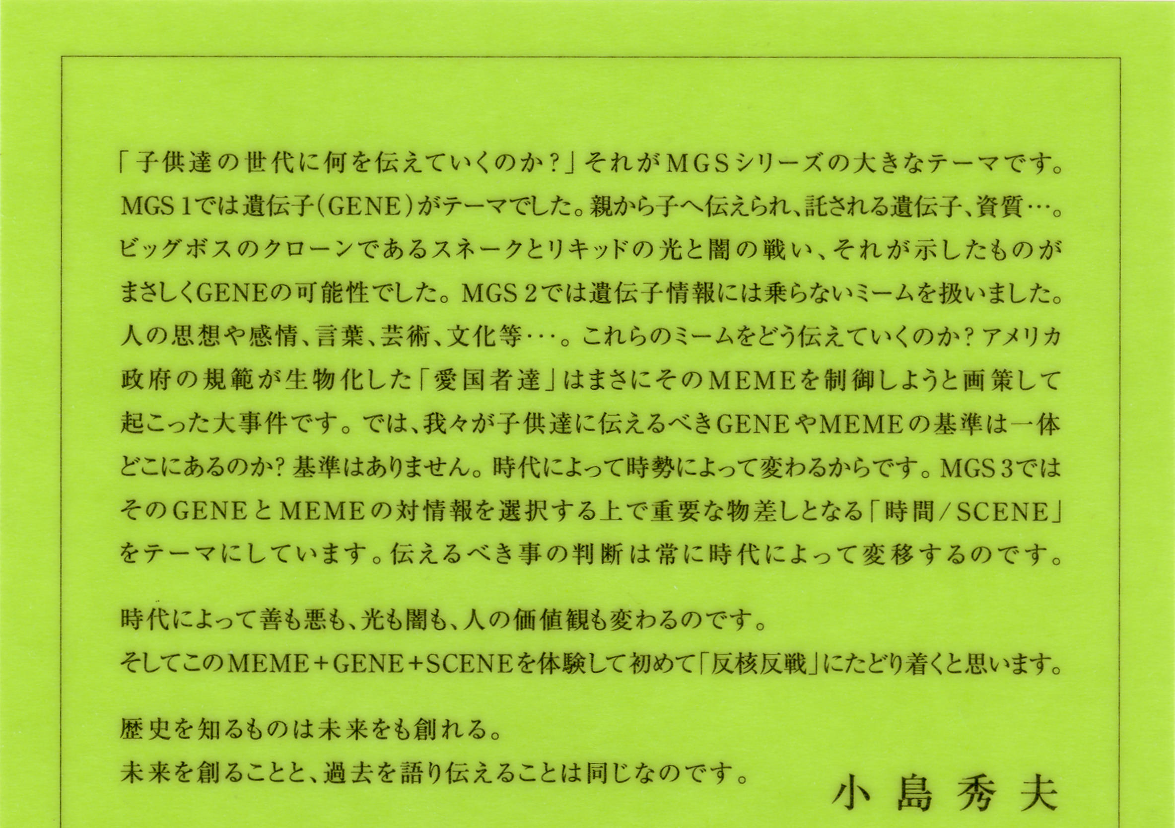 "What will we pass on to our childrens' generation?" That is the main theme of the MGS series. The theme of MGS1 was genes, the genetic information that is passed on from parent to child... The battle between light and darkness -- between Snake and Liquid, clones of Big Boss -- is a metaphor for the possibility that lies in genes. In MGS2, I talked about memes, the information not encoded in genes. Things like peoples' thoughts and emotions, words, the arts, cultures... How will we pass on these memes as time goes on? The <B>Patriots</B>, a biological incarnation of the modus operandi of the American government, cause the events of the game in the process of trying to control memes. So where can we find a rule of thumb for choosing the genes and memes we are to pass on to our children? There isn't one. It changes depending on the times. The theme of MGS3 is "scene", an important measure for helping us select genes and memes. The decisions regarding what to pass on always change depending on the times.