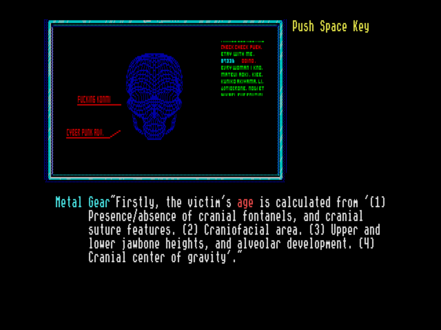 On the MSX version (and therefore possibly the original version) of Snatcher along with other radom pieces of english profanities littered throughout the game, when metal is performing scans, amongst the technical jargon is clearly reads: