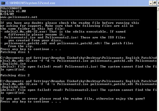 I am having trouble applying the Policenauts patch to my non translated Japanese ISOs I ripped from Image Burn. Can anybody help me? The problem is that it says that it can not read the xdelta3.0u.x86-32 when I have that file labeled exactly that way in the folder so can anybody tell me how to fix it? Well hope to get a response back soon. Also, I posted screen shots of the folder I have all the contents in and a photo of the black DOS screen that applies the patch. Well, hope to get an answer soon.