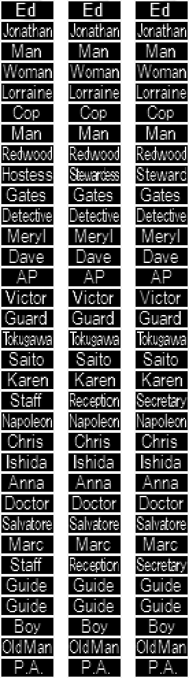 Ah, these DO use aliasing! Or anti-aliasing, whatever its called. In the meantime, here's my monochrome shot at the tags. As you can see, they are not anything like the main text font, BUT they're very clear and readable. Also a minimum of name changes: Stewardess to Hostess, and Receptionist to Clerk. Otherwise, nothing. Comments? I'll get right to work on an aliased version.Artemio wrote:Here are the original tags, unaltered in bmp format. It would be best to receive results in bmp as well, 24 bits.