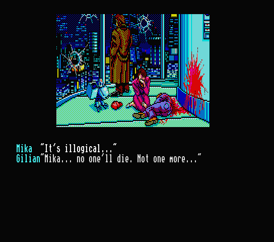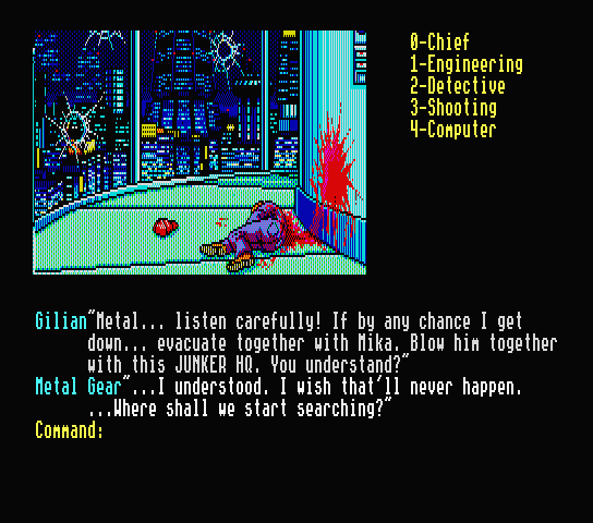 And thus we reach our conclusion. Due to a rushed schedule, Kojima's cyberpunk masterpiece was published with a dark and depressing cliff hanger. We find Snatcher-ham, who has taken Mika hostage, and dispose of him. After giving us a farewell in what I assume is Russian (as Russian letters are used in the PC88 version) and his power fades, we witness a pan-up of Junker HQ and see Mika crying over Harry's body, and Gillian declaring that the fight has just begun.