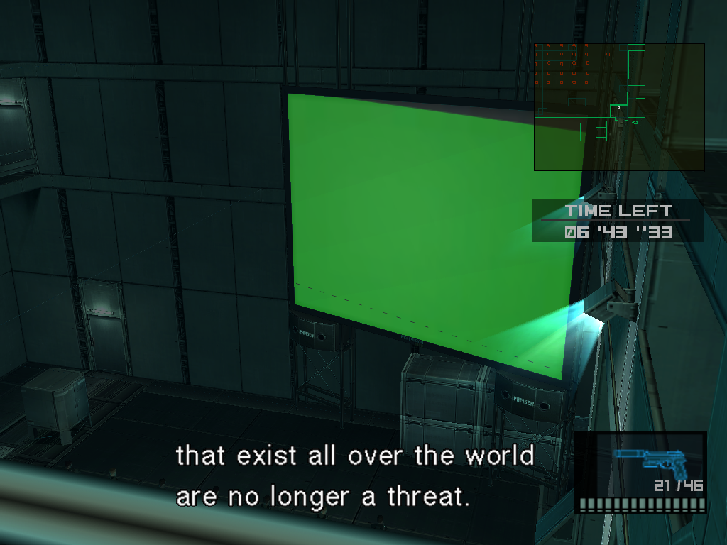 I am aware that PC version of MGS2: Substance is known for its problems with various video cards. Interestingly, I have the same bug in graphics with two different cards in tanker portion. For some reason, the video isn't shown correctly on the wall during the speech of officer. These are the cards I have used with game: